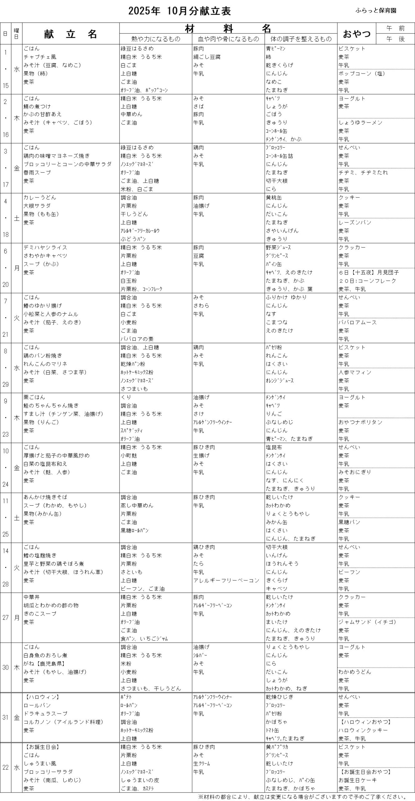 離乳食献立表6月:「PDF」 / 「画像」 5月:「PDF」 / 「画像」