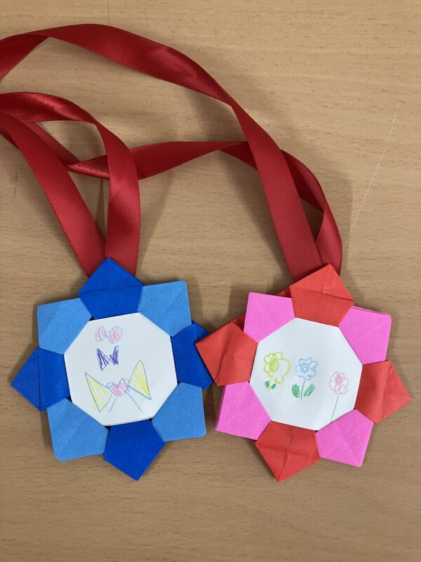 職員と子どもたちで新入園児をお祝いする会を行い、年長の子どもたちが心をこめて作ったメダルをプレゼントしました。