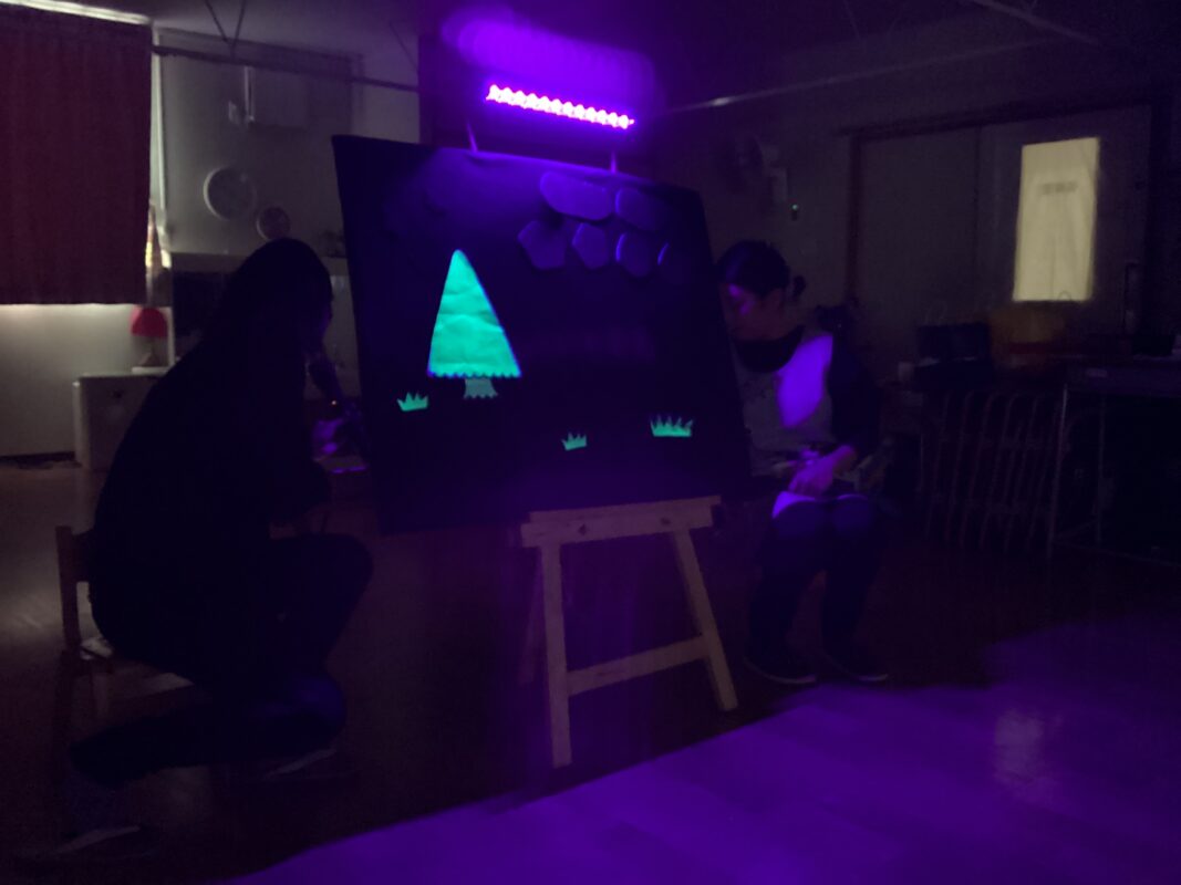 クリスマスにちなんだブラックライトシアターの出し物も目を輝かせてみていました。