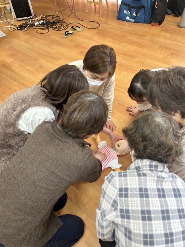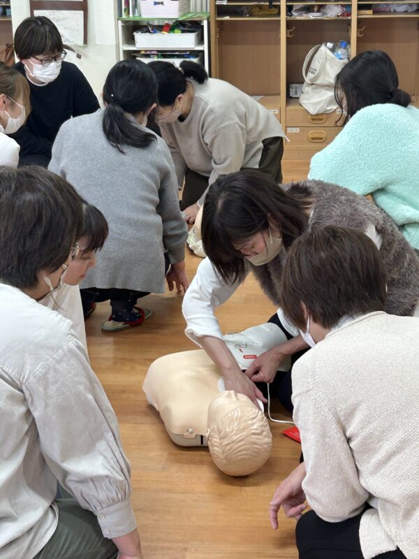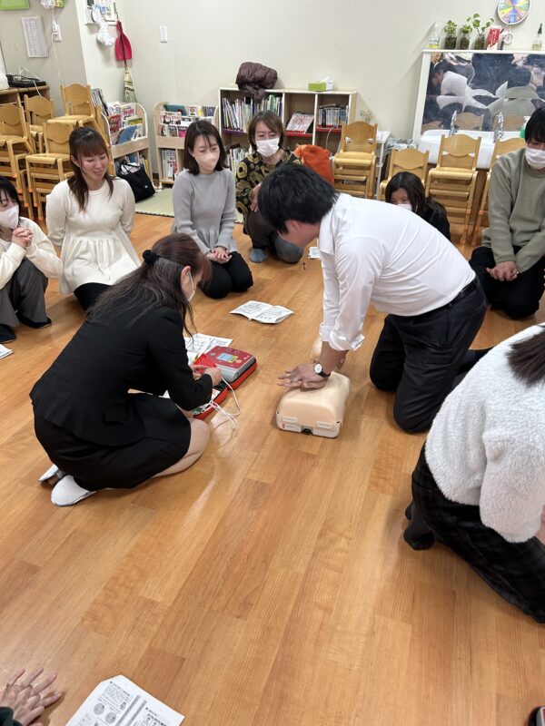 姉妹園のふらっとセントラル保育園の職員も参加しました。大人の胸骨圧迫(心臓マッサージ)では、中々胸がへこまない等の難しさを感じながら、いざというときに自分がしっかり動かなければいけないということを再確認した講習会となりました。