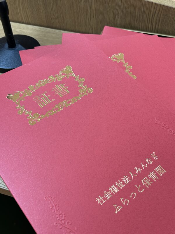 お天気にも恵まれ、来賓、保護者、職員が温かく見守る中、23名の年長さんたちに保育証書が授与されました。「ふらっと保育園はたのしかったですか?」という声に子どもたちが元気よく「はい!」とお返事。終始和やかな雰囲気で式が進みました。